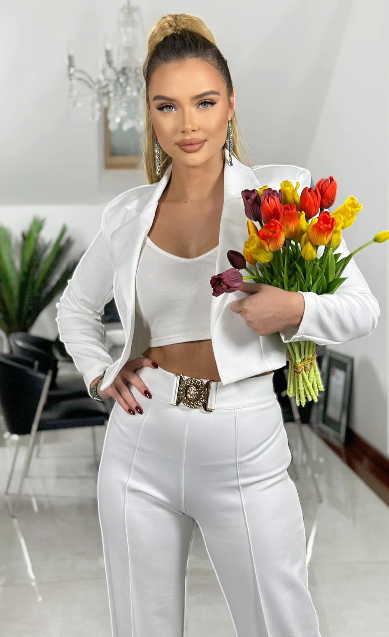 Elegancki komplet Belluci marki S. Moriss w kolorze białym to propozycja dla kobiet, które cenią ponadczasową elegancję, nowoczesny styl oraz komfort noszenia. Zestaw składa się z krótkiej marynarki z długim rękawem oraz szerokich spodni o modnym kroju. Całość tworzy harmonijną, kobiecą stylizację, która sprawdzi się zarówno w codziennych, jak i bardziej formalnych zestawieniach. Biel nadaje kompletowi świeżości, lekkości oraz klasycznego charakteru. Dzięki temu model ten doskonale sprawdzi się w pracy, podczas spotkań biznesowych, rodzinnych uroczystości czy eleganckich wyjść. To uniwersalny element garderoby, który łatwo dopasować do różnych dodatków i stylizacji. Komplet został wykonany z wysokiej jakości elastycznego materiału punto, który bardzo dobrze dopasowuje się do sylwetki. Tkanina jest miękka, sprężysta i przyjemna w dotyku, a jednocześnie zapewnia wygodę oraz swobodę ruchów. Materiał dobrze się układa, dzięki czemu komplet zachowuje elegancki wygląd przez cały dzień. Krótka marynarka o nowoczesnym kroju subtelnie podkreśla sylwetkę i nadaje stylizacji eleganckiego charakteru. Szerokie spodnie z wysokim stanem optycznie wydłużają nogi, wysmuklają sylwetkę oraz zapewniają komfort noszenia. Połączenie tych elementów sprawia, że komplet prezentuje się stylowo i nowocześnie. Model Belluci można stylizować na wiele sposobów. W połączeniu z eleganckim topem i szpilkami stworzy klasyczną stylizację idealną na oficjalne okazje. Zestawiony z prostym t-shirtem oraz sneakersami będzie doskonałą bazą codziennego, modnego looku. Wysoka jakość wykonania oraz ponadczasowy krój sprawiają, że komplet Belluci marki S. Moriss to doskonały wybór dla kobiet, które chcą wyglądać stylowo, elegancko i czuć się komfortowo w każdej sytuacji. Wymiary Rozmiar XS/S Marynarka: Szerokość pod pachami: 90 cm Długość całkowita: 38 cm Długość rękawa: 42 cm Spodnie: Szerokość w pasie: 66–80 cm Szerokość w biodrach: 90–110 cm Wysokość stanu: 30 cm Długość całkowita: 109 cm Rozmiar M/L Marynarka: Szerokość pod pachami: 90 cm Długość całkowita: 38 cm Długość rękawa: 42 cm Spodnie: Szerokość w pasie: 70–84 cm Szerokość w biodrach: 94–114 cm Wysokość stanu: 30 cm Długość całkowita: 109 cm Rozmiar XL Marynarka: Szerokość pod pachami: 94 cm Długość całkowita: 39 cm Długość rękawa: 43 cm Spodnie: Szerokość w pasie: 74–88 cm Szerokość w biodrach: 98–118 cm Wysokość stanu: 31 cm Długość całkowita: 110 cm Tolerancja wymiarów +/- 2 cm.